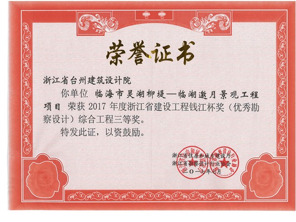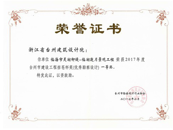 臨海市靈湖柳堤-靈湖邀月景觀工程獲2017括蒼杯獎(優秀勘察設計)一等獎