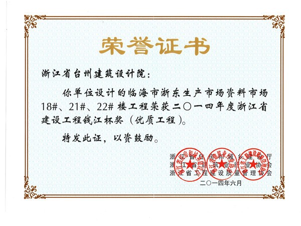 浙東生產市場資料市場18#、21#、22#樓工程獲2014浙江省建設工程錢江杯獎(優質工程)